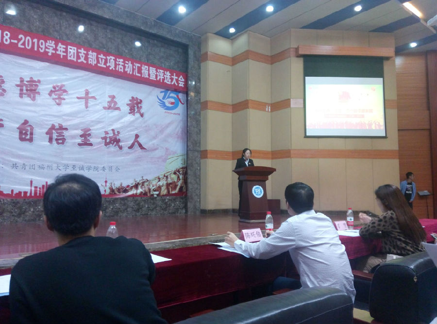 【 点击数: 144 发布时间: 2018-10-12 】 2018年10月11日晚7点,在科报厅举行福州大学至诚学院2018-2019学年团支部立项活动汇报暨评选大会。在本次大会上化学工程系2017级应用化学专业1班团支部团支书周子嵛同学在汇报大会上荣获三等奖的好成绩,同时也鼓励参与此次汇报暨评选大会的其他两个团支部——2016级化学工程与工艺专业团支部与2017级化学工程与工艺专业团支部。